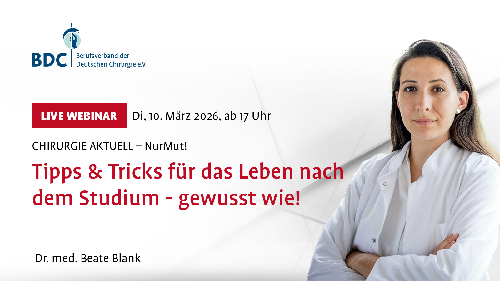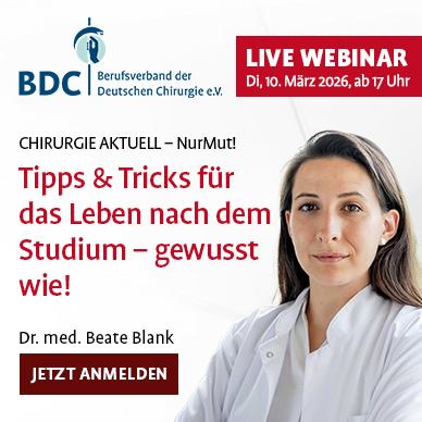 Du willst ChirurgIn werden? Das verstehen wir, ehrlich! Schließlich haben wir den Entschluss auch selbst einmal gefasst. Auf dieser Seite versorgt Dich der Berufsverband der Deutschen Chirurgie e.V. (BDC) mit nützlichen Informationen für Deine Karriere in der Chirurgie.